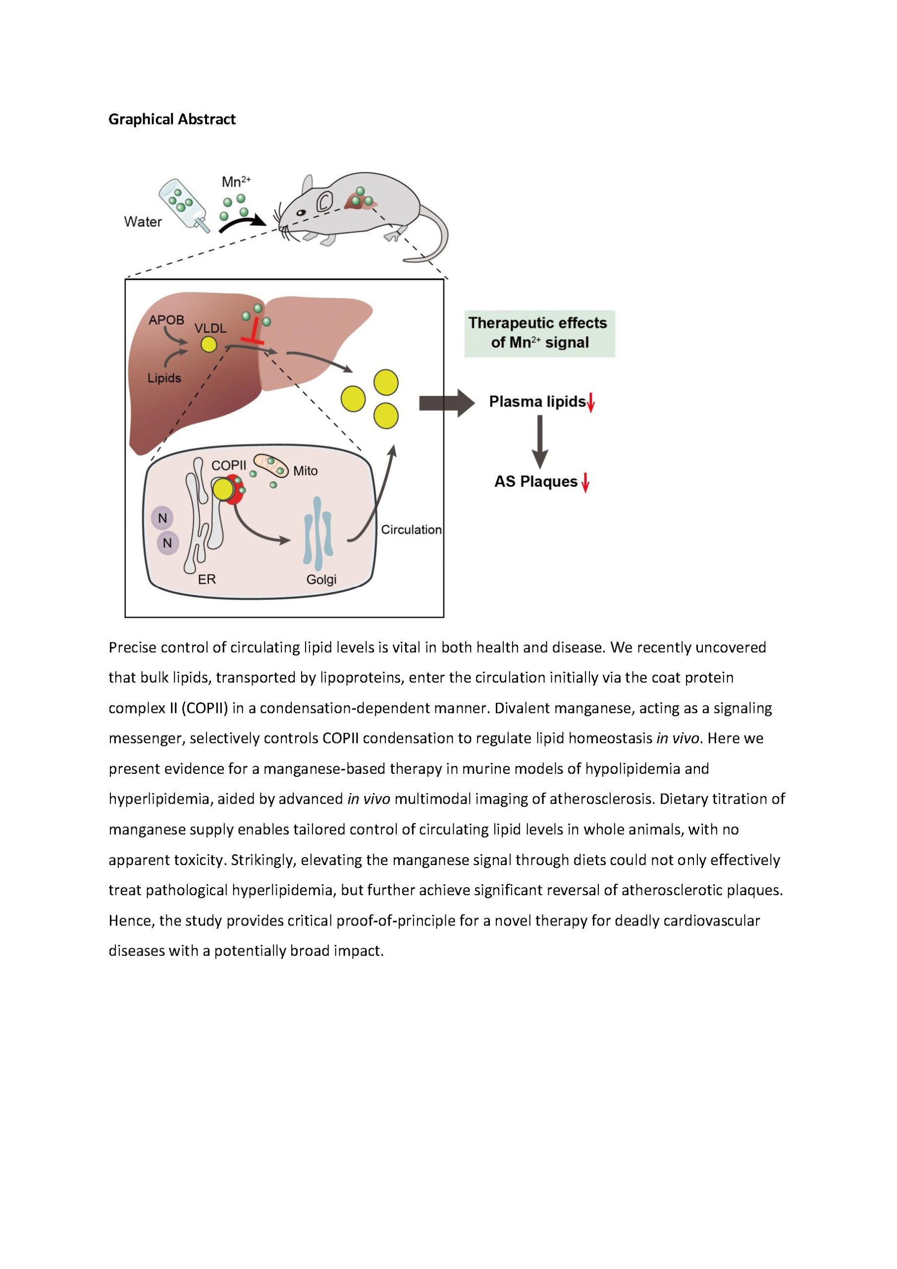 王晓和他的同事们发现,锰元素能与脂蛋白所需的一种复合物结合,脂蛋白是将胆固醇和甘油三酯等脂质输送到血液中的化学载体。这种被称为衣壳蛋白复合物 II(COPII)的复合物需要维持一种非常精确的化学平衡,而锰元素破坏了这种平衡。由于这种破坏,研究人员发现,在他们研究的小鼠中,即使是口服锰,也能显著降低血液中的脂质浓度,并清除在啮齿动物血管中形成的斑块。