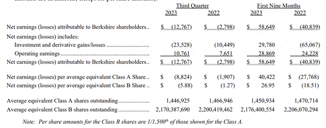 运营利润增长但净利润仍下降的原因在于,三季度伯克希尔股权证券持仓的投资收益出现了241亿美元的巨额投资亏损。不过前三季度收益仍有235亿美元。