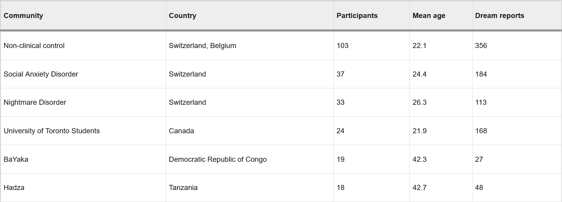 多伦多大学的人类学家在两个月的时间里实地收集了巴雅卡人和哈扎人的梦境叙述。关于西方群体梦境的数据来自过去的研究,这些研究发表于2014年至2022年之间。