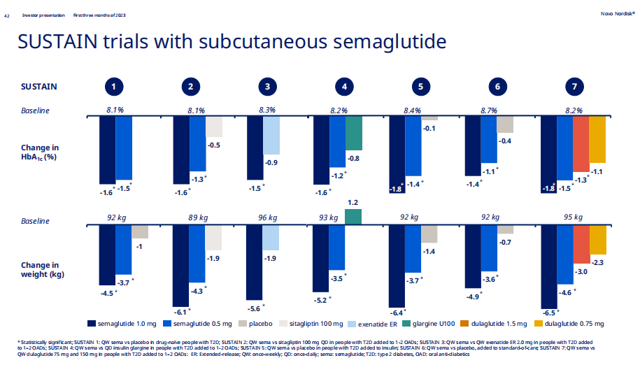 在代号名为PIONEER(先驱者)的研究中,诺和诺德评价了司美格鲁肽片剂3/7/14mg三个剂量在不同基线患者中的疗效与安全性。对比PIONEER研究与SUSTAIN研究(评估司美格鲁肽1.0mg注射剂型系列研究)的疗效数据来看,以基线HbA1c 8.1%、体重92kg亚组举例,片剂14mg的减重数据(-4.2kg)并没有打败注射剂1.0mg的减重数据(-4.5kg)。