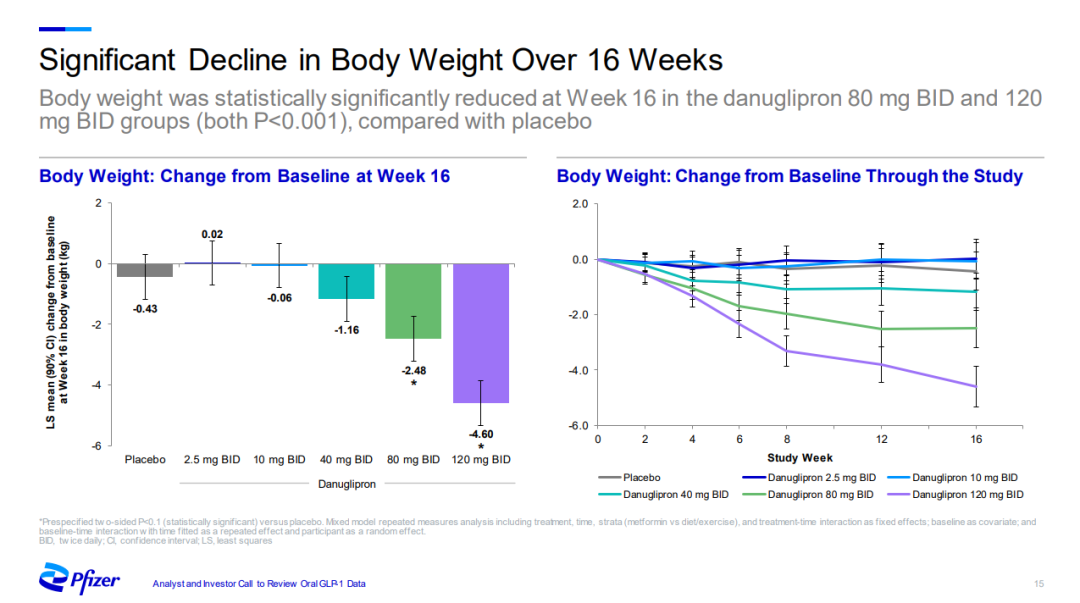 另一项为期16周的研究显示,接受80mg和120mg药物治疗的患者体重均显著下降,减重绝对值分别为2.48kg和4.60kg。