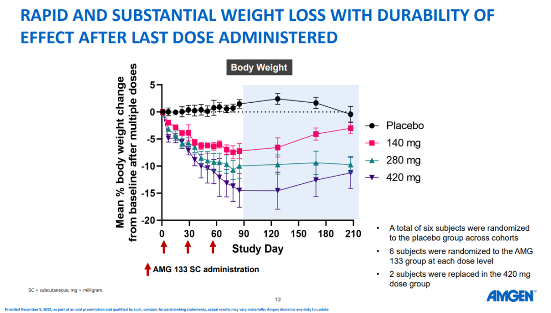 经过12周治疗,即3次给药后,140mg低剂量组减重幅度为7.19%,420mg高剂量组平均减重14.52%。研究未观察到减重平台期,换言之,14.52%的降幅尚未触碰到AMG133减重的天花板,如果延长治疗期,患者体重可能进一步下降。此外,280mg组的减重效果在停药的150天内与第12周基本持平,420mg组在观察期结束时实现减重11.2%,提示停药后反弹较小。