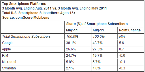 研究公司ComScore报告称,Android在手机市场份额占据更多优势。据该公司称,截至2011年8月的三个月内,Android在美国的智能手机操作系统市场占到43.7%,5月底,Android市场份额为 38.1%,3个月内跃升了5.6%。ComScore表示,苹果公司iOS平台占27.3%的市场份额,排在第二位。5月时,苹果iOS在美国智能手机 操作系统市场占26.6%,上升慢于Android。