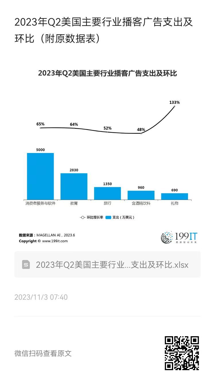 - 2023年Q1美国主要行业播客广告支出(附原数据表)