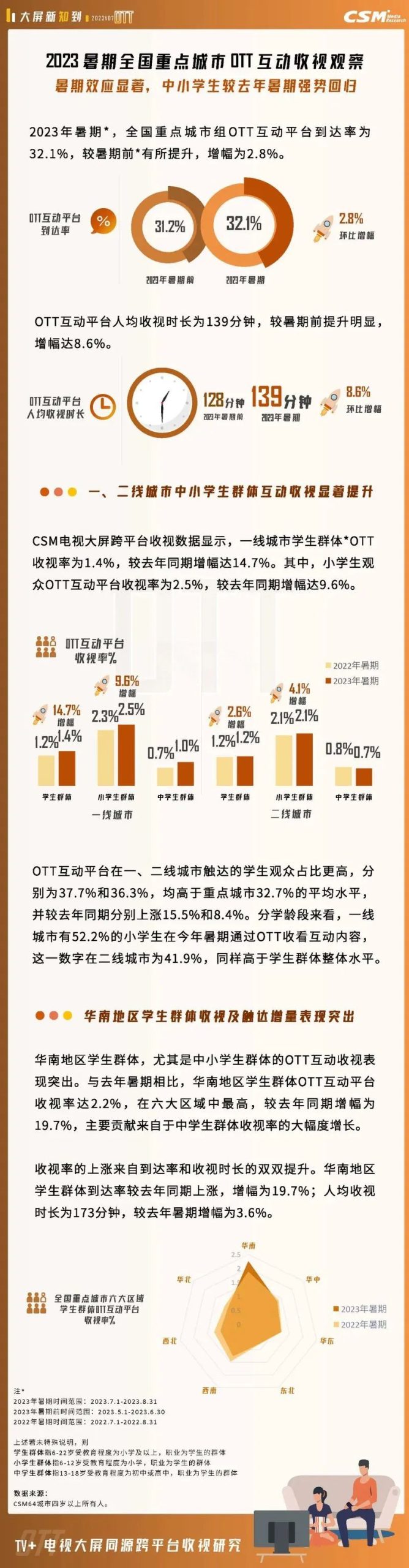 2023年暑期全国重点城市OTT互动收视观察:人均收视时长139分钟 来源:收视中国 更多阅读:2023半年全球电视ODM工厂出货量排名全球付费电视的收视率将上升,但收入将下降阿里影业财报:2023财年阿里影业营收人民币35.20亿元 盈利人民币2.95亿元报告:释放可寻址电视的潜力Omdia:2023年免费广告支持流媒体电视(FAST)频道产生63亿美元收入Hub:2023年美国联网家庭报告Omdia:线性电视收视率继续下降研究显示智能电视占OTT电视收视的一半NPD:研究显示SVoD 用户对价格更加敏感Hub Entertainment:研究显示观众随着他们的电视机发展而变化未来五年 SVOD 订阅量将增长 4.85 亿DTG:未来电视服务的重点BBC:汽车将成为电视消费未来的目的地Digital TV Research:预计2028年全球SVOD收入上升到124亿美元Digital TV Research:2027年西欧 SVOD 市场将增加 7300 万订阅用户