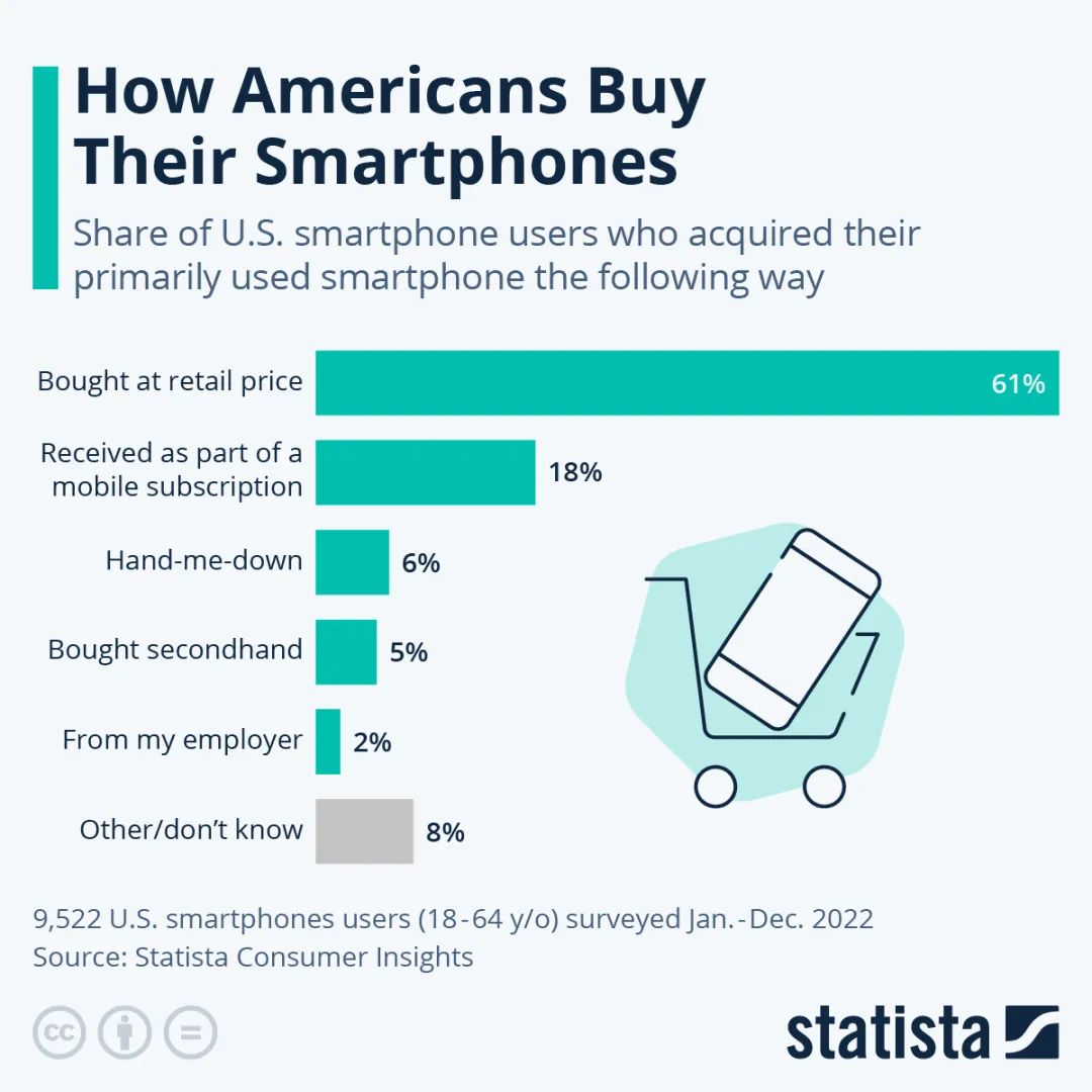 考虑到这些数字,很明显不是每个人都买得起一部全新的手机,这也解释了为什么二手手机市场如此繁荣。根据Statista Consumer Insights的调查结果显示,绝大多数美国智能手机用户仍然以零售价格购买他们的新手机,第二受欢迎的选择是手机套餐捆绑在一起的手机。有趣的是,在接受调查的大约9500名智能手机用户中,只有5%的人表示他们的手机是二手的,而6%的人说他们的手机是从朋友或家人那里得到的。