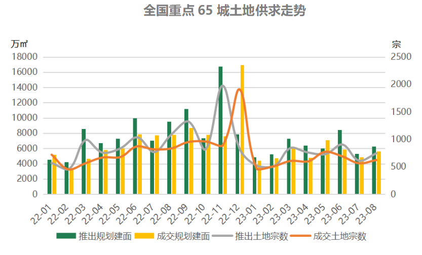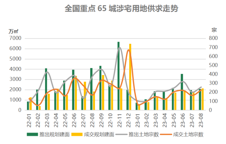 l 8月重点65城合计成交宅地仅224宗、2139.77万平米,同比分别上扬33%和17%。但从今年1-8月的总体情况看,出现了供需缩量的态势,同比下滑幅度在2成以上。土地市场供需的缩量,来自于房地产市场复苏形势尚不明朗,同时也符合今年土地供地计划整体缩量的趋势。但随着各地楼市的刺激政策积极释放,市场信心将有极大提振,但难以改变区域间冷热不均的情况。