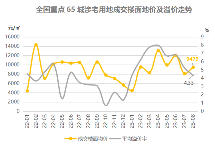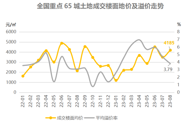 8月全国重点监测65城成交土地平均楼面地价4185元/平米,环比、同比分别上扬20%和95%。8月监测65城平均宅地楼面地价达9479元/平米,较上个月的8089元/平米上扬17%,较同期也上扬32%;从溢价水平看,继续呈回调之势,8月仅为4.33%,为今年以来月度最低。