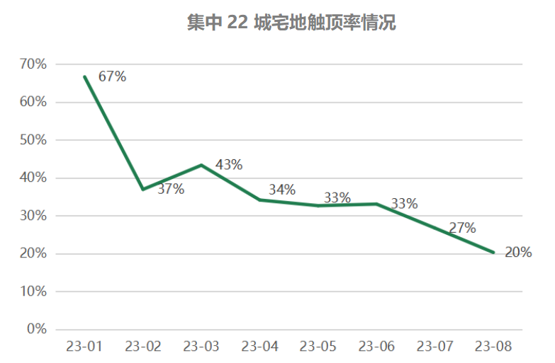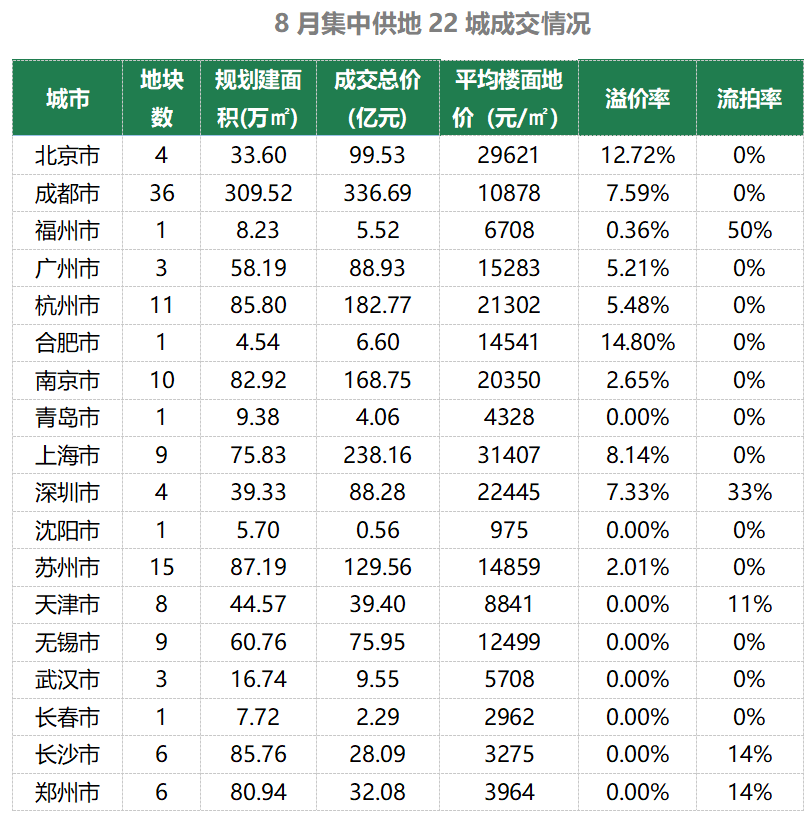 l 原集中供地的22城有18个城市参与土拍,剔除到纯保障房用地后,合计成交宅地129宗,其中,成都成交36宗远超其他城市,也位列当月城市土地出让金的榜首。今年以来土地市场热度逐月下滑,本月仅20%的地块触达限地价,长三角城市由热转凉较为明显。8月份正暂时仍处于土拍平淡的瓶颈期,进入到9-10月份市场压力随着政策释放会有所缓解。