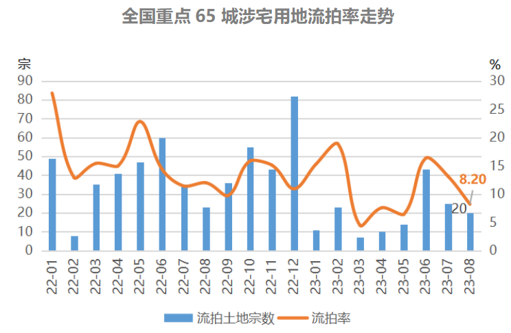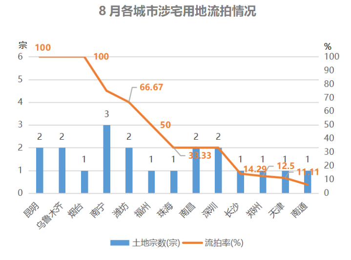 l 8月重点65城的溢价水平继续呈回调之势,仅为4.33%,为今年以来月度最低。而流拍率为8.2%,涉及包含昆明、乌鲁木齐、烟台、南宁、潍坊、福州等13个城市共20宗地块,部分城市在地方平台托底下流拍率较上个月显著降低。