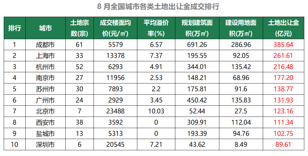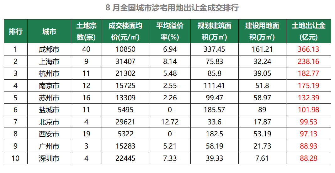 3、城市土地出让金成交排行——成都大举推地,成榜单大户