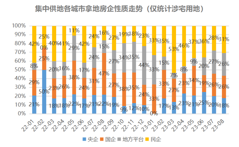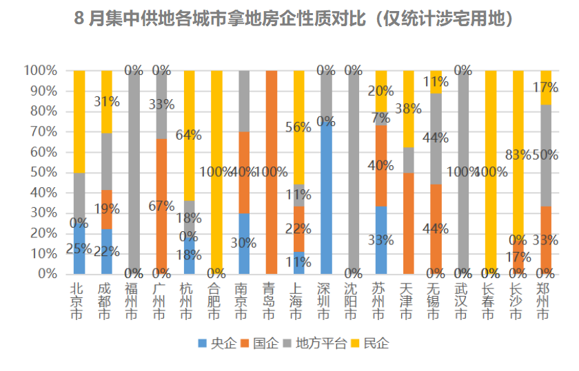 8月参与集中土拍的129宗涉宅宅地中(剔除纯保障房地块),央企、国企、地方平台、民企拿地比重分别为18%、26%、26%、31%。呈现的趋势是民企拿地比重低位,地方平台托底比重增加。
