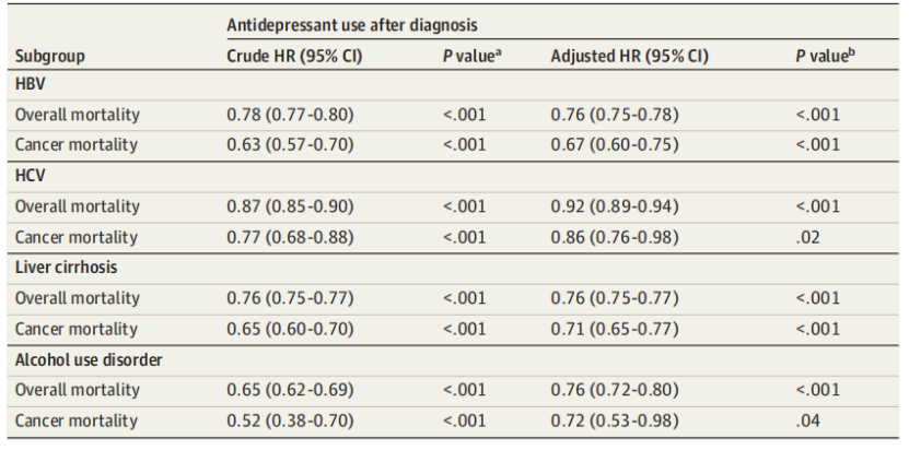 在诊断前使用抗抑郁药物的患者中,抗抑郁药物使用组的总体死亡率为15.68人/100人年,未使用组为12.14人/100人年。在HCC患者中,诊断前1年使用任何种类的抗抑郁药物与总体死亡风险无关,但是在调整协变量后,与总体死亡风险升高10%有关。