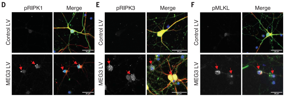 体外实验显示,MEG3过表达可以诱导神经元程序性坏死,通过CRISPR敲除程序性坏死相关RIPK1、RIPK3和MLKL,或者使用程序性坏死抑制剂ponatinib、dabrafenib、necrosulfonamide可以逆转。