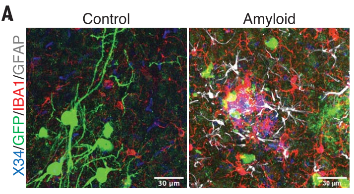 移植18个月后,小鼠出现了完全的淀粉样斑块病理。在这个时间点,非Aβ病理对照小鼠脑内的人类神经元总体是健康的,而移植到Aβ小鼠中的人类神经元表现出了严重的小胶质细胞和星形胶质细胞增生性神经营养不良。