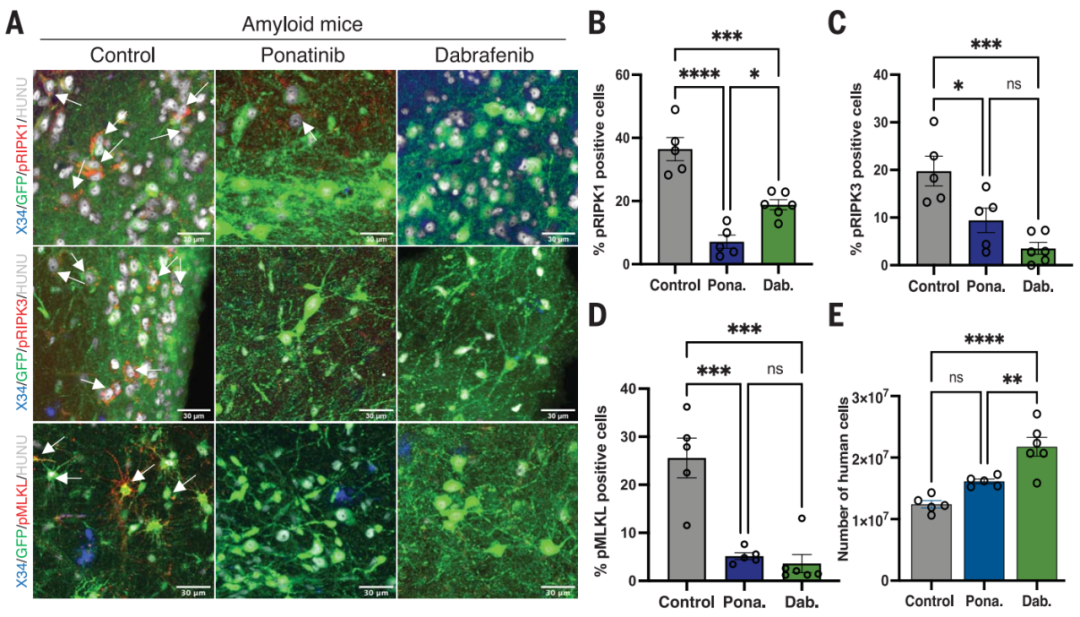 研究者也尝试给小鼠口服ponatinib(30mg/kg)或dabrafenib(50mg/kg)治疗。ponatinib是是RIPK1和RIPK3抑制剂,已被FDA批准用于治疗急性淋巴细胞白血病和慢性髓细胞白血病。dabrafenib是一种特异性更强的RIPK3抑制剂。