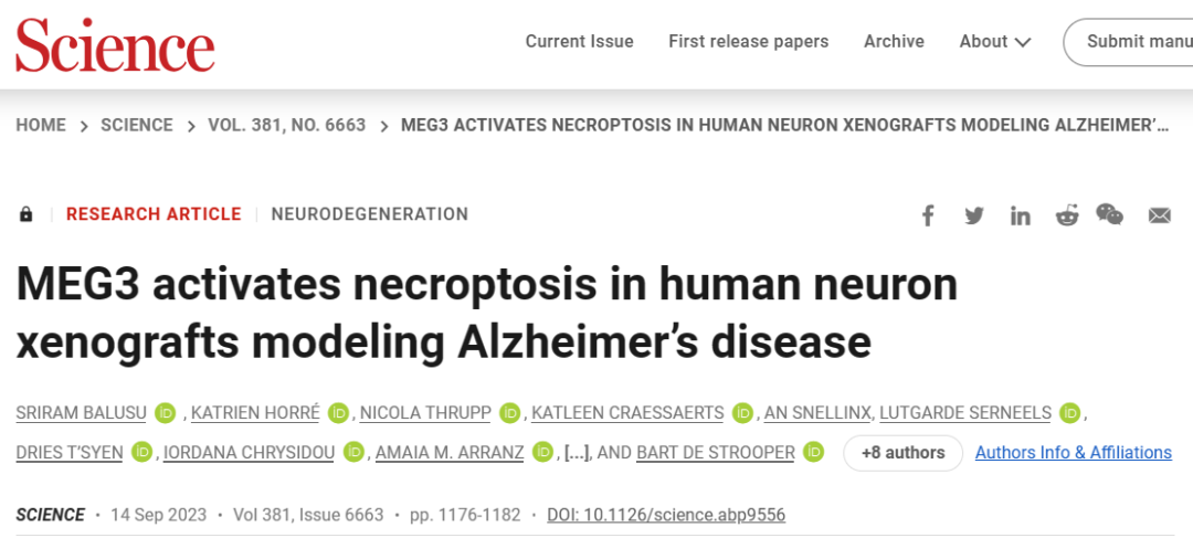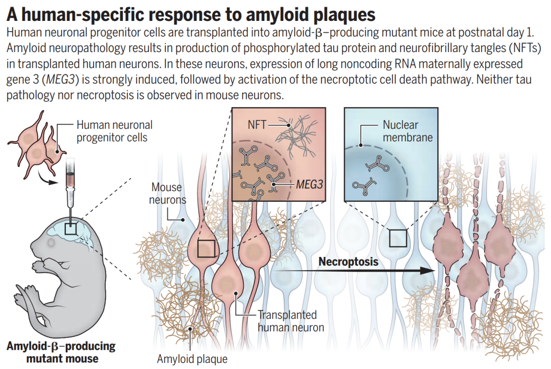 研究者发现,其中一种长非编码RNA MEG3起了决定性作用。MEG3表达能够诱导人类神经元程序性坏死(necroptosis),且这种作用是人类特有的,小鼠神经元Meg3并不会在Aβ病理背景下改变表达。