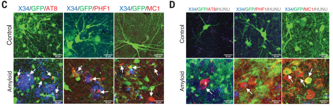 从图中可以看出,移植人类神经元中出现了大量的神经斑tau蛋白。在Aβ斑块周围20μm范围内,2%(AT8)、5%(PHF1)、3%(MC1)被染色。这些病理在移植后6个月就出现了,说明在早期Aβ沉积就开始驱动tau磷酸化。