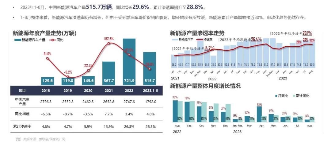 - 新能源汽车产量,1-8月同比增长29.6%,增速高于汽车市场整体4.8%的增幅。