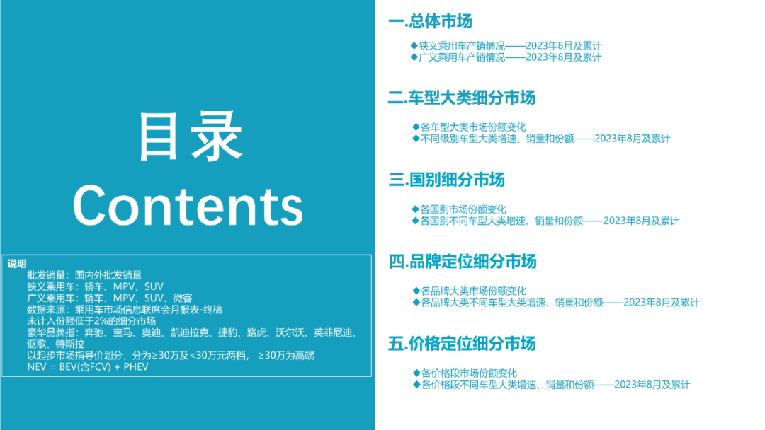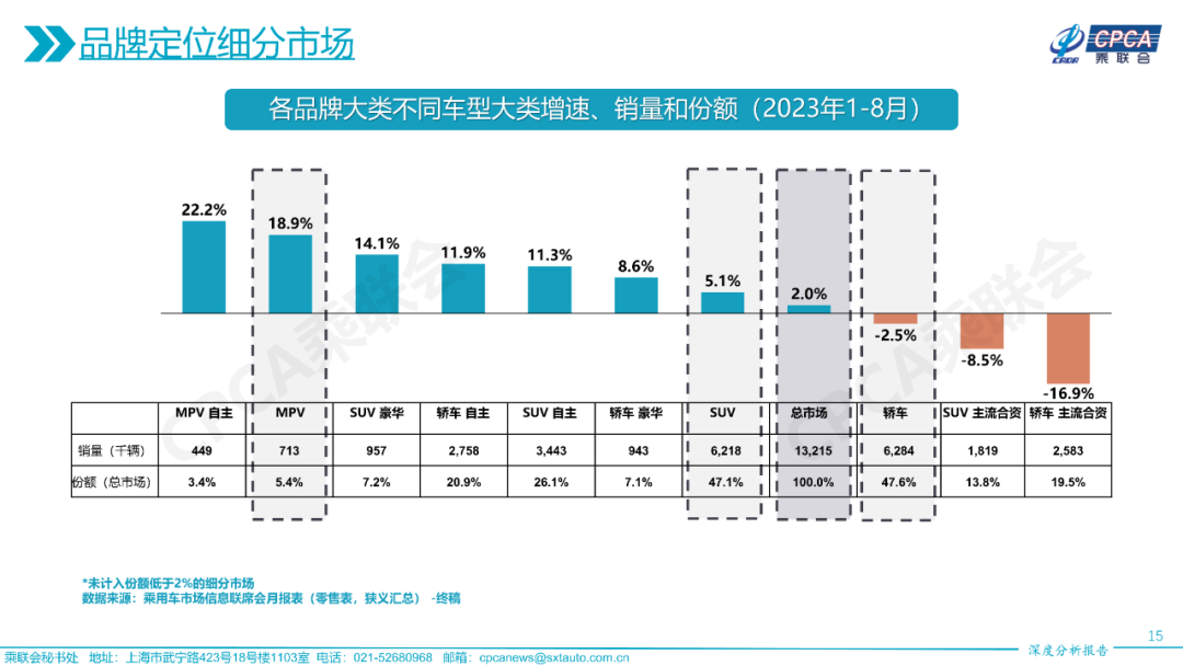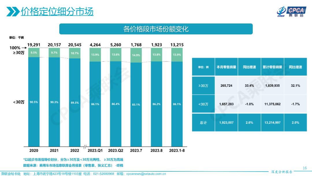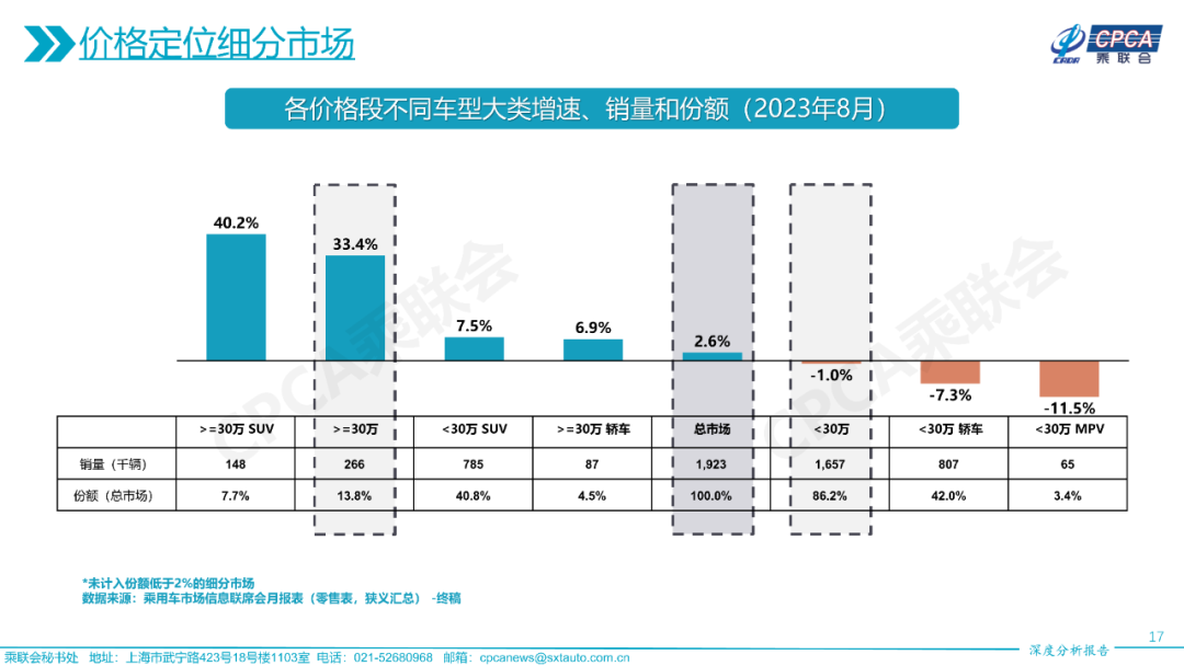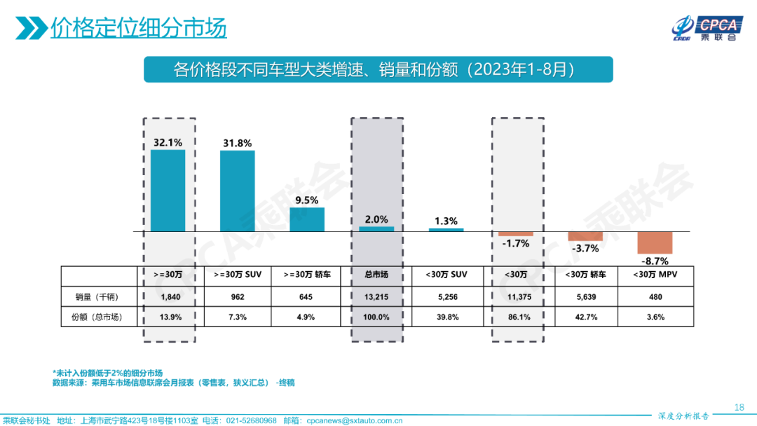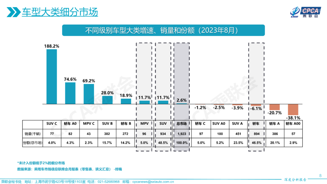 - 各价格段不同车型大类增速、销量和份额——2023年8月及累计