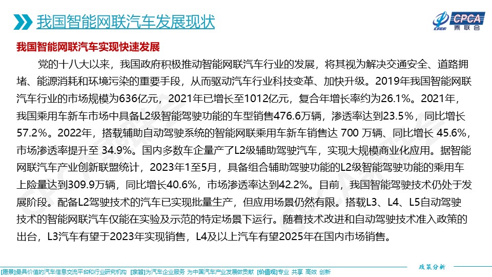 乘联会:关于我国智能网联汽车发展现状及其相关政策的分析 更多阅读:乘联会:2024年7月份全国乘用车市场分析乘联会:2021年12月份全国乘用车市场月度分析乘联会:2021年6月份全国乘用车市场深度分析报告199IT数据工具众览第三期:乘联会汽车行业统计数据 吃了宝马mini的瓜 汽车数据看哪家?乘联会:2024年7月中国新能源汽车月度渗透率首次突破50%乘联会:2023年6月皮卡厂商批发销量排名快报乘联会:2023年第82期新能源商用车市场信息周报乘联会&科瑞:2024年4月汽车智能网联洞察乘联会:2023年10月各品牌零售销量排名快报乘联会:2023年8月皮卡厂商批发销量排名快报乘联会&科瑞咨询:2023年7月汽车智能网联洞察报告乘联会:2023年4月各品牌零售销量排名快报乘联会:2023年4月份全国乘用车市场分析乘联会&科瑞咨询:2023年3月汽车智能网联洞察乘联会:2023年3月份全国乘用车市场分析