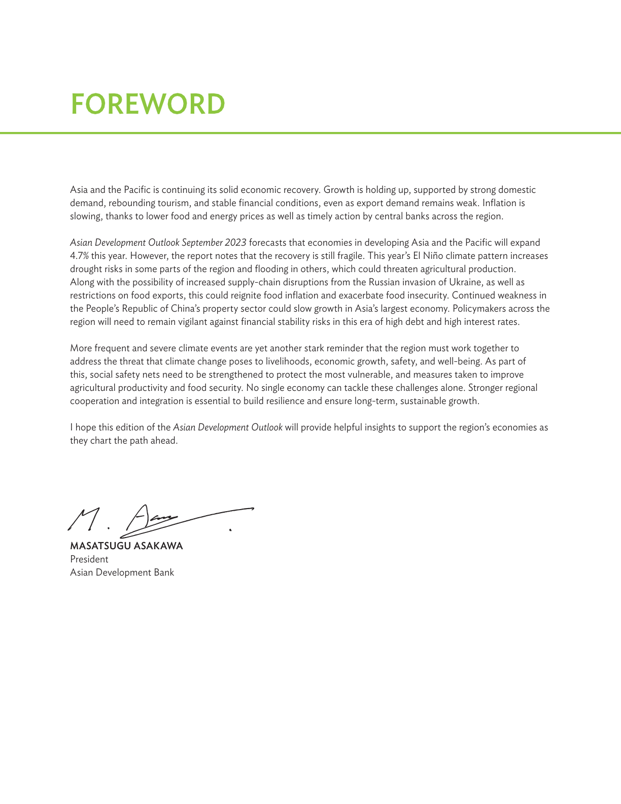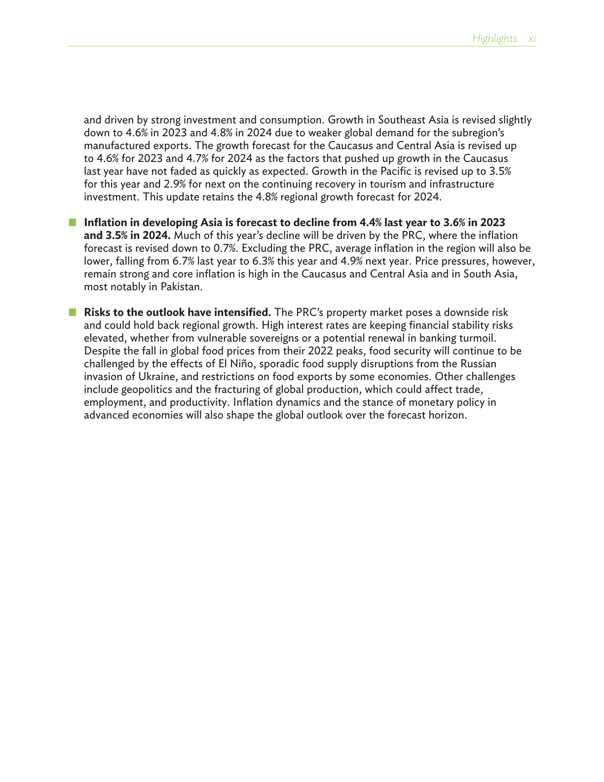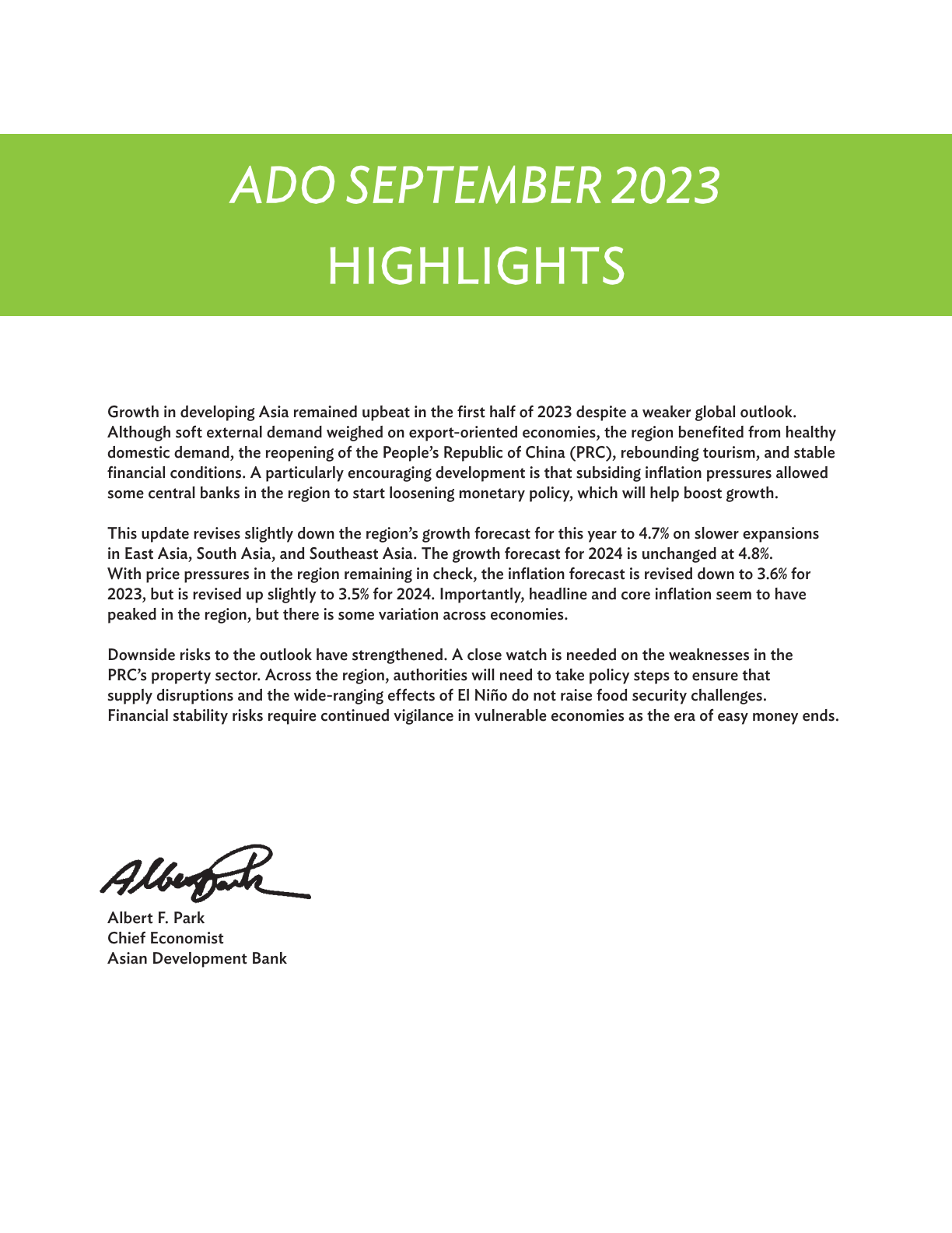 “亚洲发展中的经济体持续展示出强劲的增长势头。同时,通胀压力也在逐渐减弱。”亚洲开发银行首席经济学家朴之水(Albert Park)说,“一些本地区国家的央行已经开始降低利率,这将刺激经济增长。然而,政府仍需警惕本地区所面临的多种风险。气候变化所引发的极端天气事件以及厄尔尼诺所带来的影响,提醒我们各个经济体必须共同合作,加强韧性建设,以保护最弱势群体。”