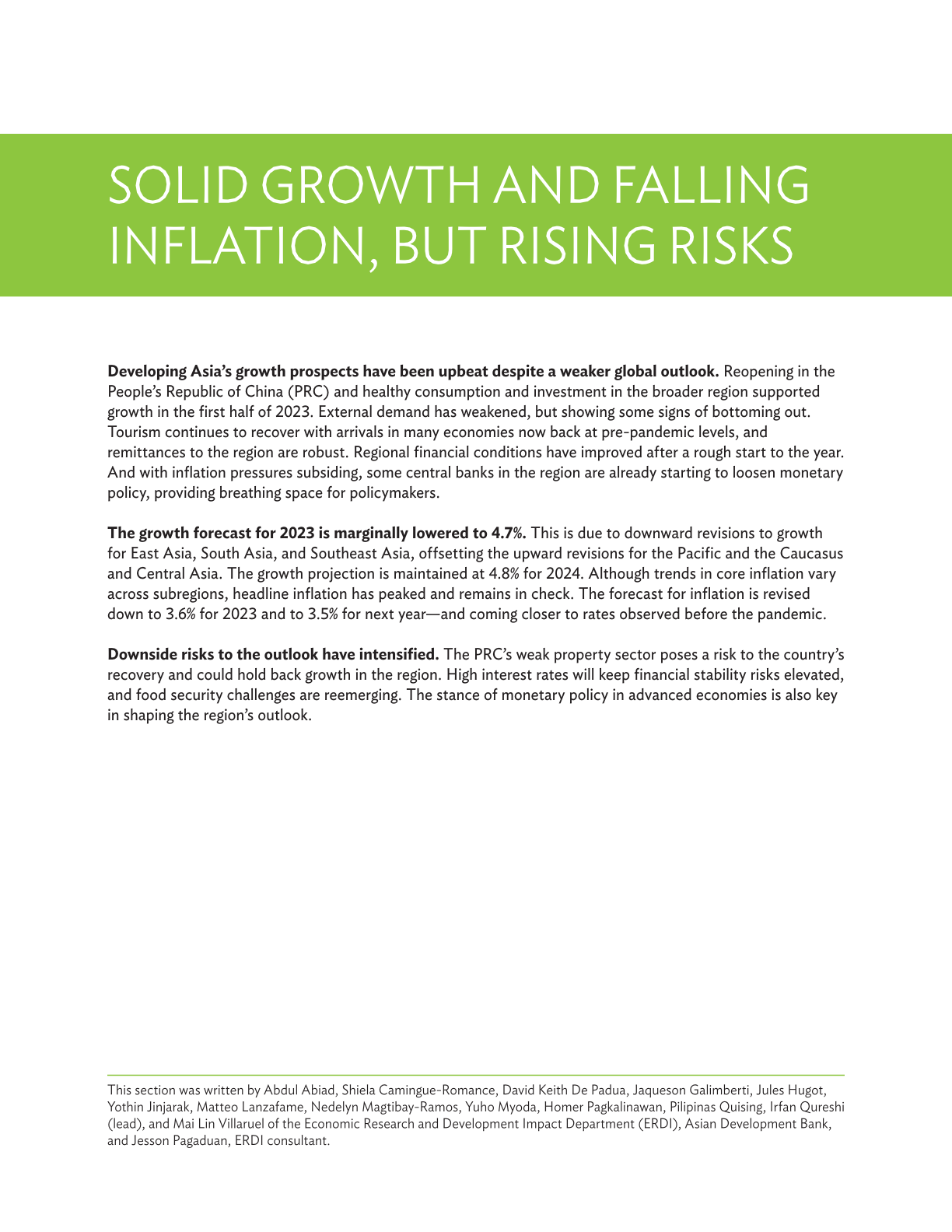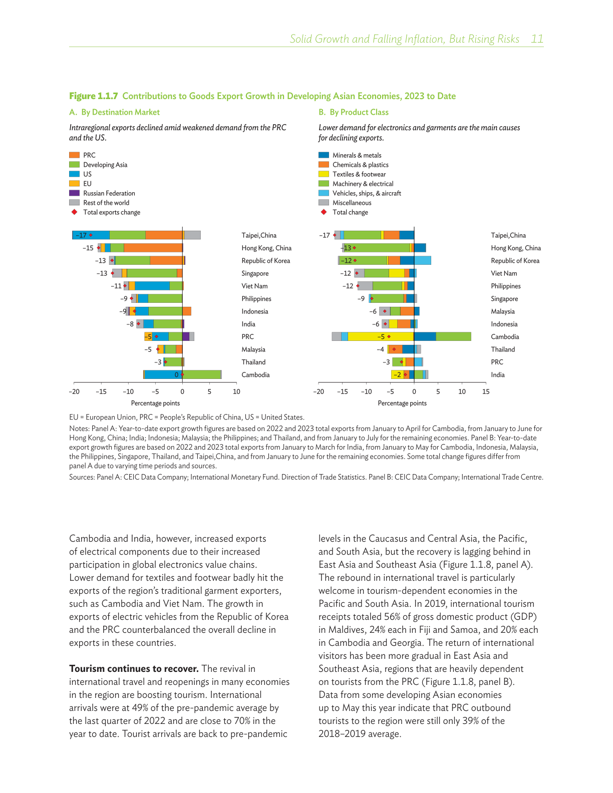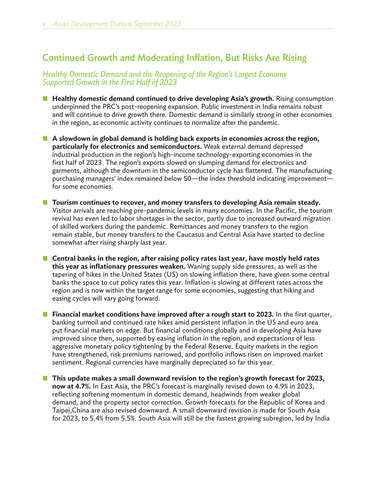 尽管全球前景走弱削弱了出口需求,但受稳健的内需以及中华人民共和国(中国)疫情防控全面放开的推动,亚太地区今年上半年的经济增长令人乐观。旅游业回升,服务业充满韧性,流入本地区的汇款保持良好势头,以及金融状况改善,均在支持地区经济活动,而大部分经济体的通胀水平于去年触顶后回落。