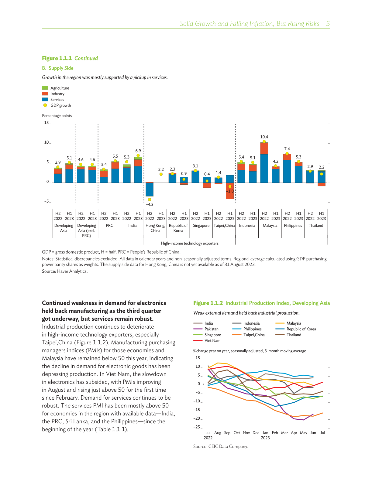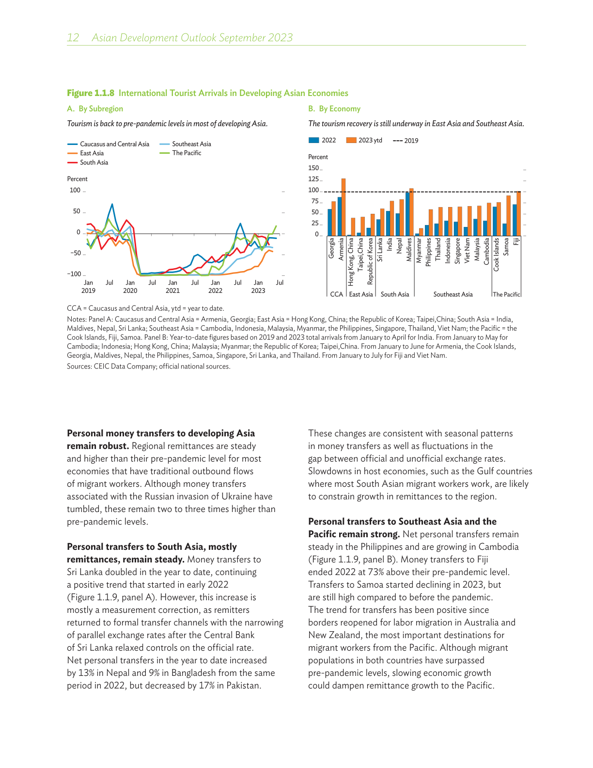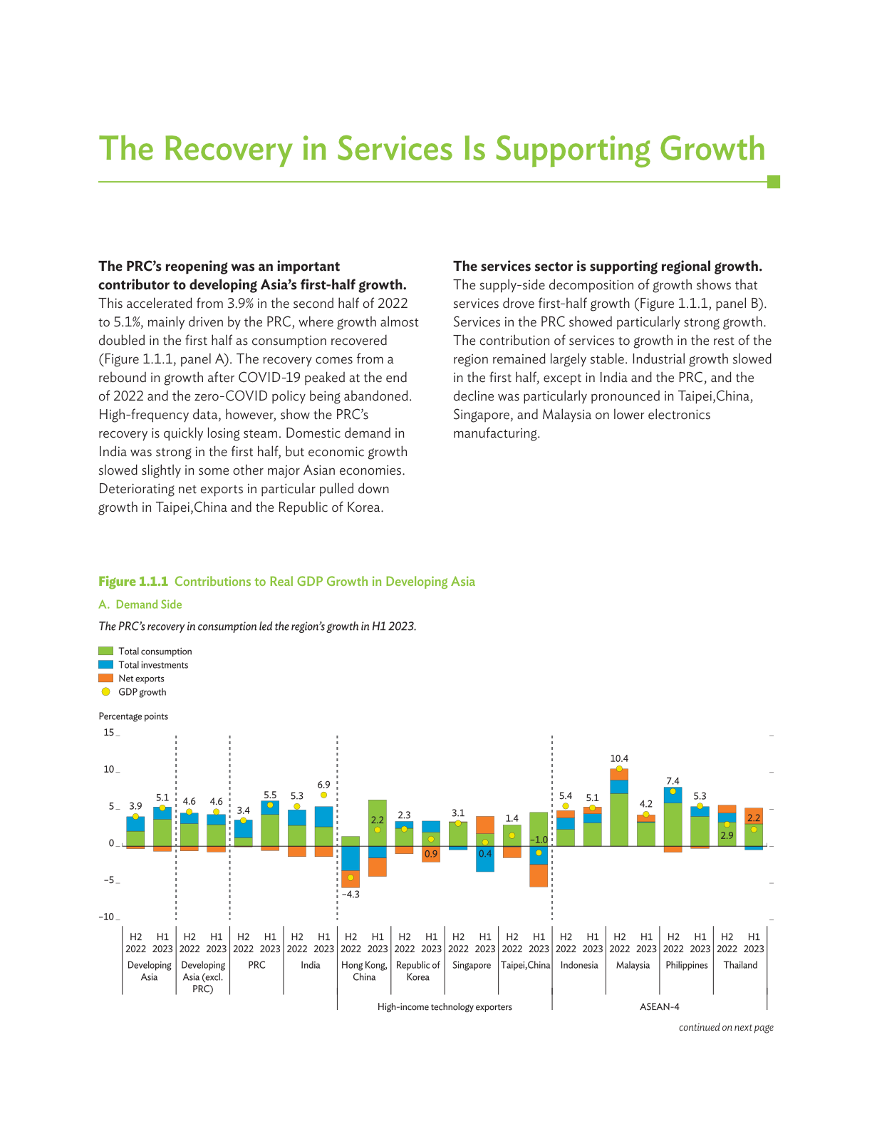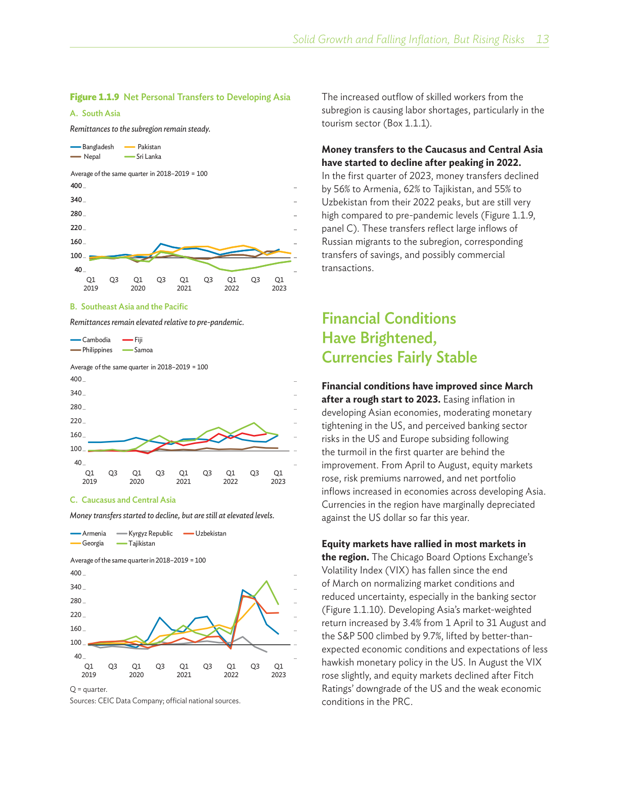 尽管全球前景走弱削弱了出口需求,但受稳健的内需以及中华人民共和国(中国)疫情防控全面放开的推动,亚太地区今年上半年的经济增长令人乐观。旅游业回升,服务业充满韧性,流入本地区的汇款保持良好势头,以及金融状况改善,均在支持地区经济活动,而大部分经济体的通胀水平于去年触顶后回落。