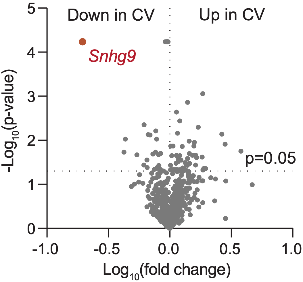 他们发现了很多差异表达的基因,不过在本研究中,他们将重点放在了编码长非编码RNA的基因上,结果Snhg9就浮出水面了。与无菌小鼠相比,有菌小鼠肠道中Snhg9的水平下降最多。其他实验方法得出的数据,也证实了在有菌的情况下,肠道Snhg9表达大幅下降。