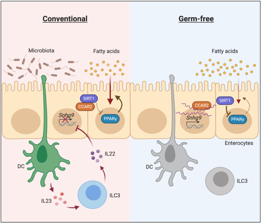王宇浩等人研究发现,当细菌出现在肠道中时,细菌来源的特异性抗原会被髓样细胞上的受体识别,导致髓样细胞被激活并释放细胞因子IL-23,进一步激活3型固有淋巴样细胞(ILC3),促进IL-22的释放,直接作用于肠道上皮细胞,抑制Snhg9的表达,PPARγ活性增强,脂质吸收/代谢也增强。
