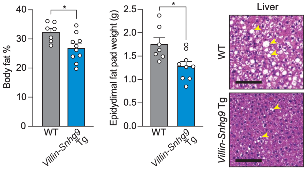 更重要的是,在这个研究中,他们在肠道细胞中发现了肠菌调控脂质吸收的关键基因Snhg9,它编码一个长非编码RNA(lncRNA)。肠菌的存在会导致Snhg9低表达,肠道脂质吸收增强,小鼠容易长胖;无菌小鼠或Snhg9过表达小鼠,肠道脂质吸收受损,小鼠不容易发胖。