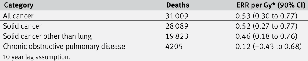 到随访结束时,有103553人死亡,其中31009人死于癌症,28089人死于实体瘤。总的来看,辐射暴露量每增加1Gy,因癌症死亡的风险增加53%,因实体瘤死亡的风险增加52%。如果排除吸烟导致肺癌这一影响因素的话,辐射暴露量每增加1Gy,因实体瘤死亡的风险增加46%。