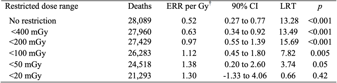 具体来看,累积剂量为0-400mGy时,每Gy导致因实体瘤死亡的风险增加63%;在0-200mGy累积剂量内,每Gy增加97%;在0-100mGy累积剂量内,每Gy增加112%;在0-50mGy累积剂量内,每Gy增加138%(不显著);在0-20mGy累积剂量内,每Gy增加130%(不显著)。