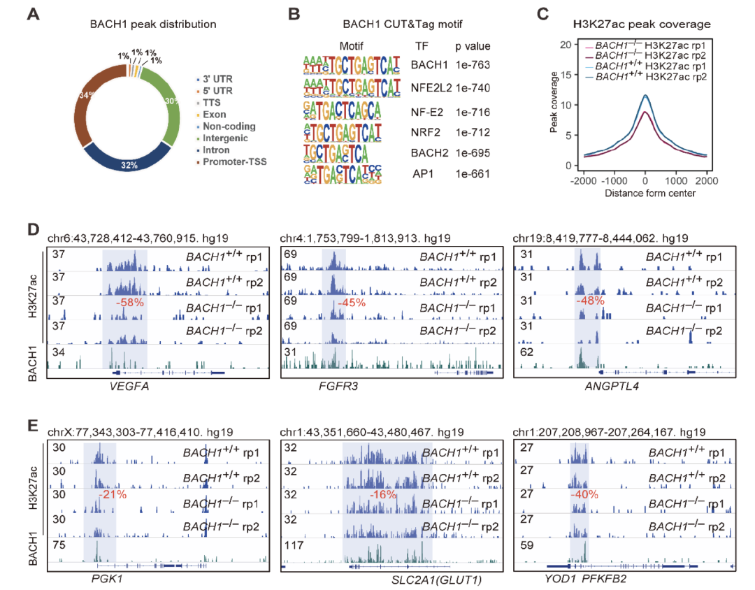 进一步的研究发现,当敲除BACH1后,全基因组以及血管生成和糖酵解基因的启动子和增强子的组蛋白H3K27ac水平显著降低。