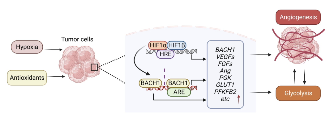 研究开展到这里,研究者联想到另一个与BACH1功能非常相似的转录因子——缺氧诱导因子(HIF1α)。在肿瘤缺氧条件下,HIF1α的稳定会刺激血管生成和糖酵解基因的表达,进而促进肿瘤中血管的生成。