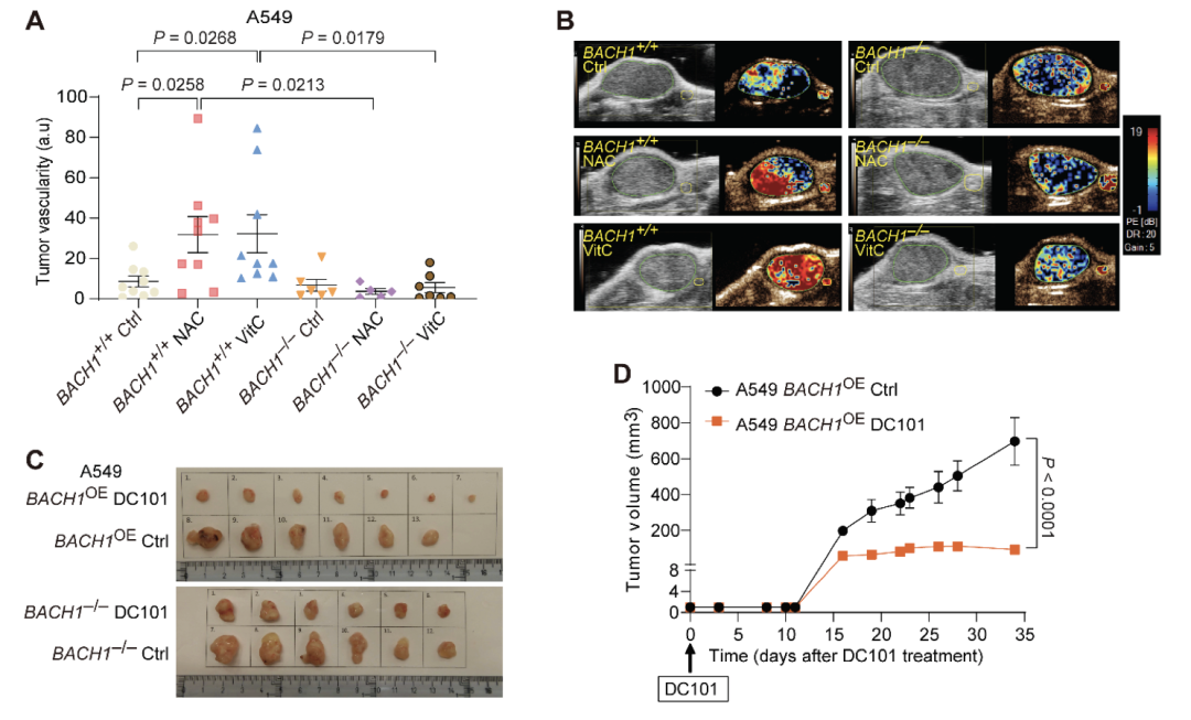 结果很明显,在抗氧化剂维生素C和N-乙酰半胱氨酸的使用下,小鼠模型中肿瘤内血管数量明显增加。而敲除BACH1,则会消除这种效应。