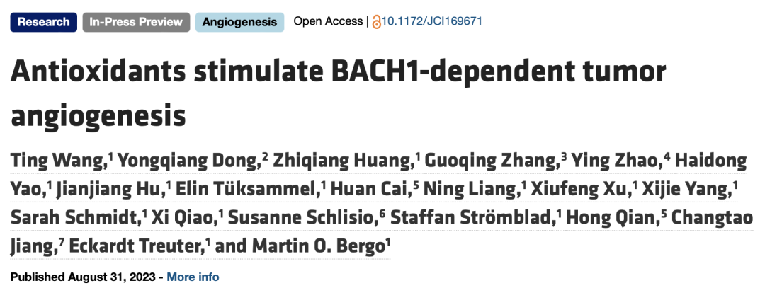[1]Wang T, Dong Y, Huang Z, Zhang G, Zhao Y, Yao H, Hu J, Tüksammel E, Cai H, Liang N, Xu X, Yang X, Schmidt S, Qiao X, Schlisio S, Strömblad S, Qian H, Jiang C, Treuter E, Bergo MO. Antioxidants stimulate BACH1-dependent tumor angiogenesis. J Clin Invest. 2023 Aug 31:e169671. doi: 10.1172/JCI169671. Epub ahead of print. PMID: 37651203.