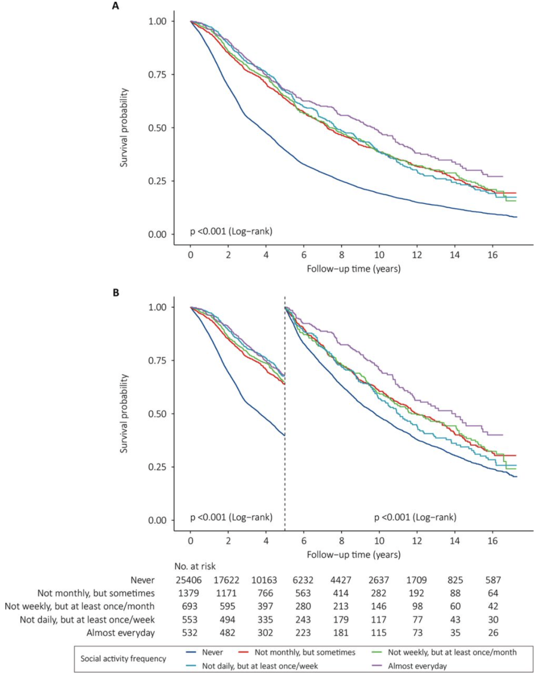 值得注意的是,在最先前随访的5年中,社会活动越频繁,生存时间也确实会更长。但随访5年后,社交活动频率与总生存时间之间存在阈值效应,只有几乎每天都参加社交活动的老年人才能显著延长总生存时间,其中死亡时间约延长了204%。