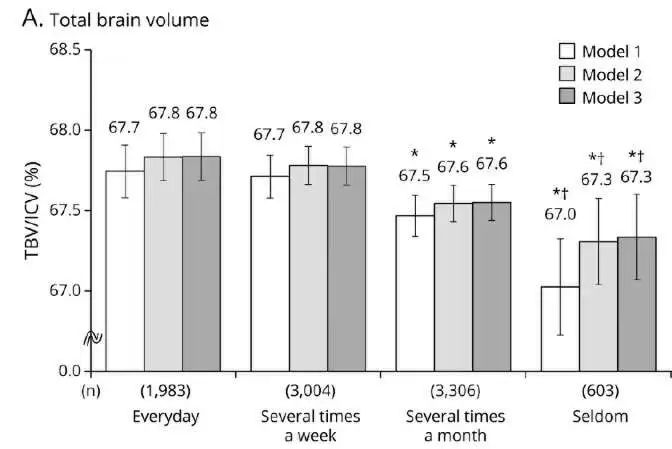 结果显示,经过多变量调整后,社牛的大脑总体积明显大于社恐。具体来说,社交频率最高组的脑总体积占颅内总体积百分比为67.8%;随着社交频率的降低,大脑总体积占比也呈下降趋势;而该比例在社交频率最低组为67.3%。