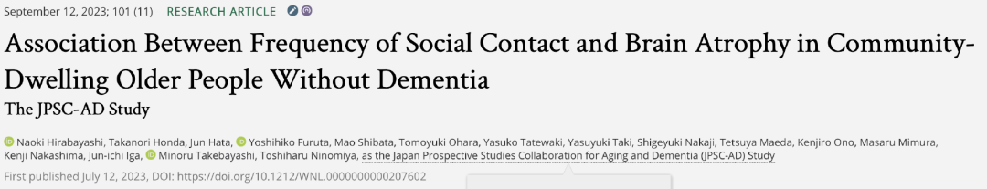 [2]Hirabayashi N, Honda T, Hata J, Furuta Y, Shibata M, Ohara T, Tatewaki Y, Taki Y, Nakaji S, Maeda T, Ono K, Mimura M, Nakashima K, Iga JI, Takebayashi M, Ninomiya T; as the Japan Prospective Studies Collaboration for Aging and Dementia (JPSC-AD) Study. Association Between Frequency of Social Contact and Brain Atrophy in Community-Dwelling Older People Without Dementia: The JPSC-AD Study. Neurology. 2023 Sep 12;101(11):e1108-e1117. doi: 10.1212/WNL.0000000000207602. Epub 2023 Jul 12. PMID: 37438128.