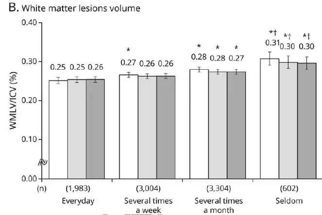 更精细地划分下,随着社交频率的降低,大脑白质病变体积会显著增加。与最“社牛”组相比,最“社恐”组的白质病变体积为0.30%,远小于前者的0.26%。