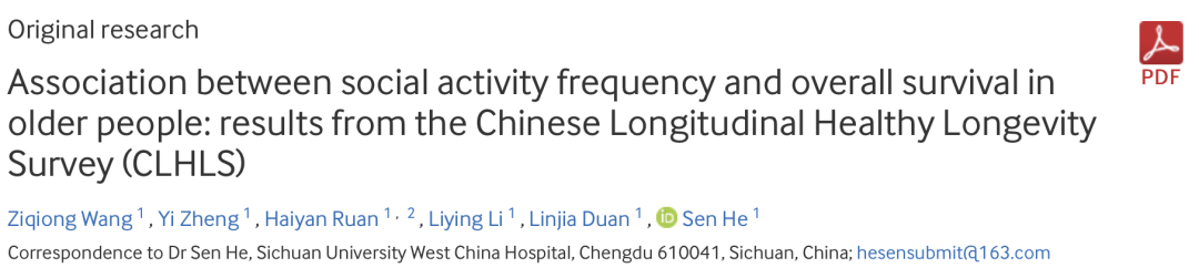 [1] Wang Z, Zheng Y, Ruan H, et alAssociation between social activity frequency and overall survival in older people: results from the Chinese Longitudinal Healthy Longevity Survey (CLHLS)J Epidemiol Community Health 2023;77:277-284.