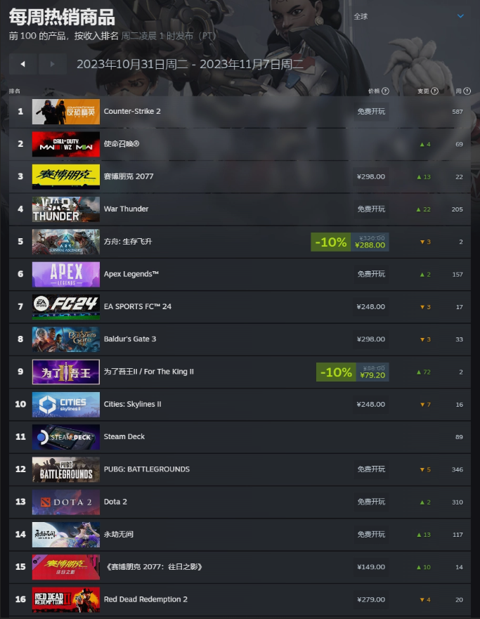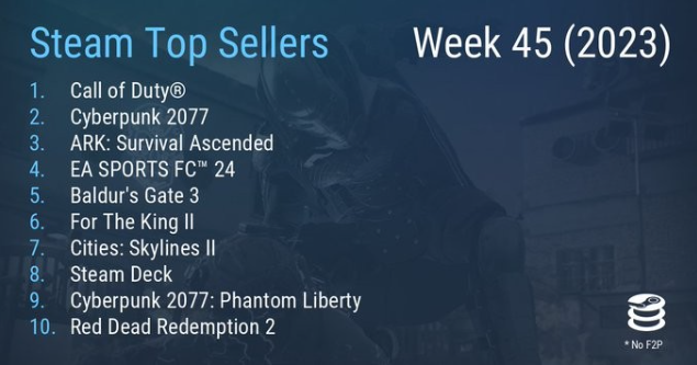 V社公布了 Steam 最新一周销量榜(2023年10月31日-11月7日)。在本周的全球榜单中,排除免费游戏后,《使命召唤》拿下第一,该游戏包含《使命召唤:现代战争 III 2023》《使命召唤:现代战争 II 2022》和《使命召唤:战争地带》。