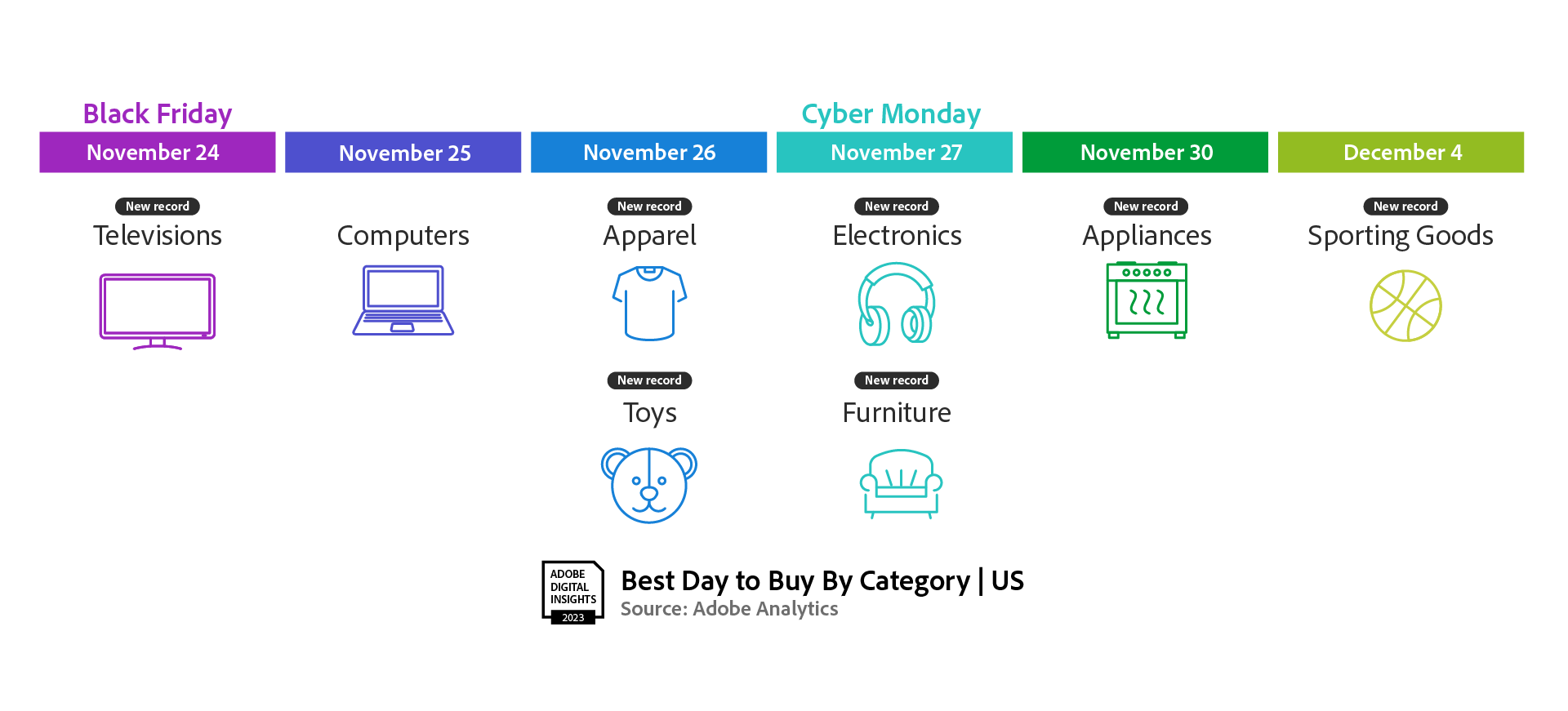 Adobe预计,今年假日季的折扣将达到创纪录的水平,最高可达标价的35%。在Adobe跟踪的18个类别中,玩具、电子产品和服装预计将提供最大的折扣。玩具的折扣预计将达到价格的35%(2022年为34%);电子产品的折扣将达到30%(2022年为25%);服装的折扣将达到25%(2022年为19%)。其他有明显折扣的类别包括体育用品(24%),电视(22%),家具/床上用品(19%)。