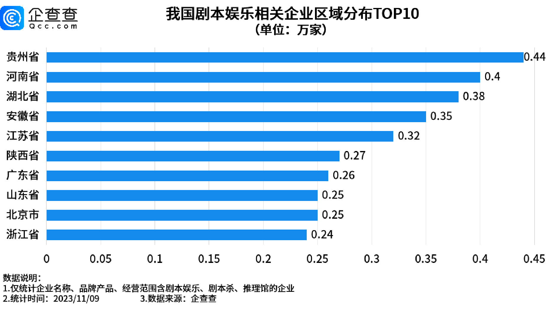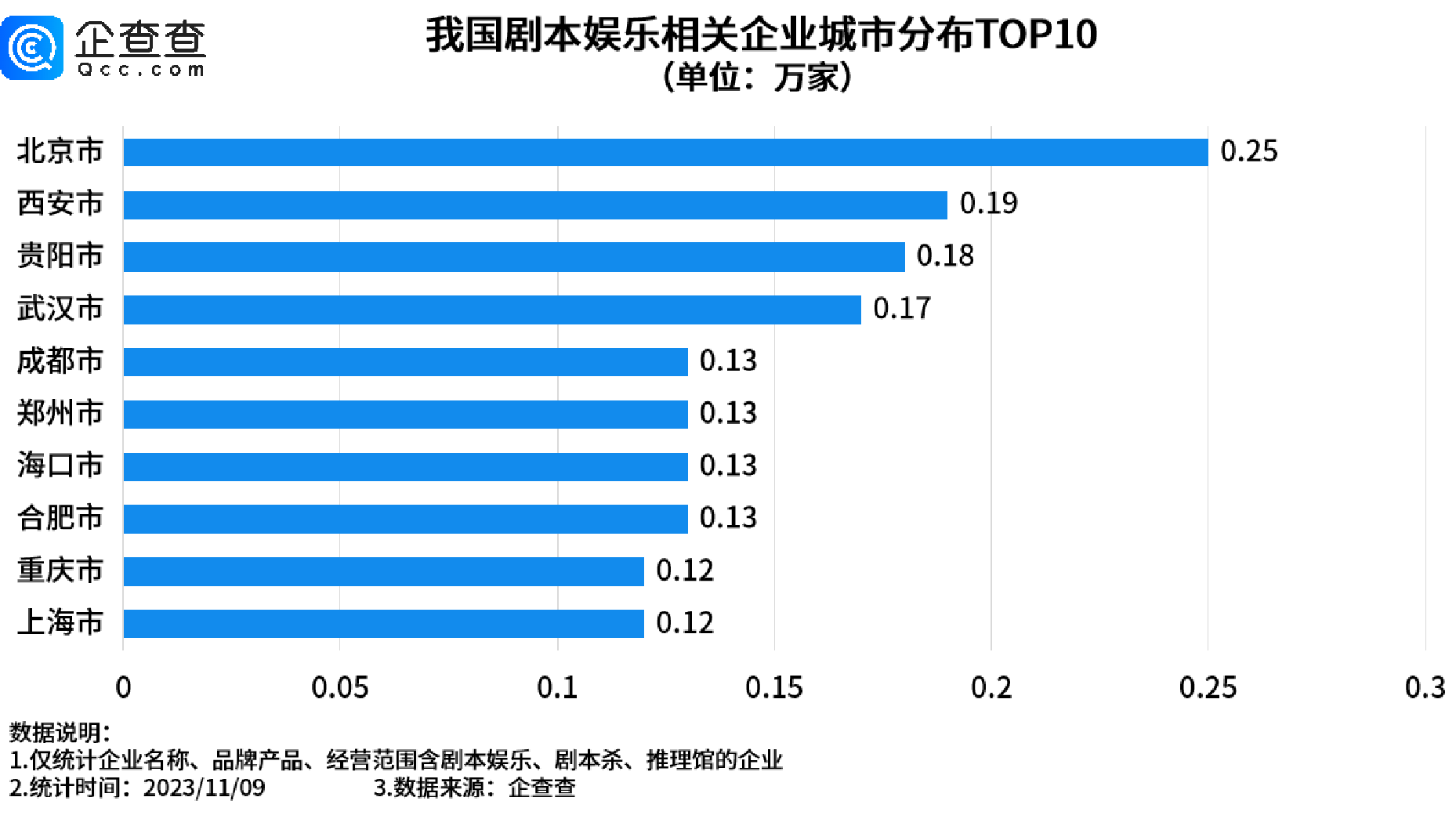 今年我国剧本娱乐相关企业注册量仍高速增长。企查查数据显示,2023年至今新增3.5万家,其中,前10月新增3.41万家,同比增长243.36%。从城市来看,北京现存剧本娱乐相关企业0.25万家,位居第一。西安、贵阳分别现存0.19万家、0.18万家,位居前三。此后是武汉、成都、郑州等地。