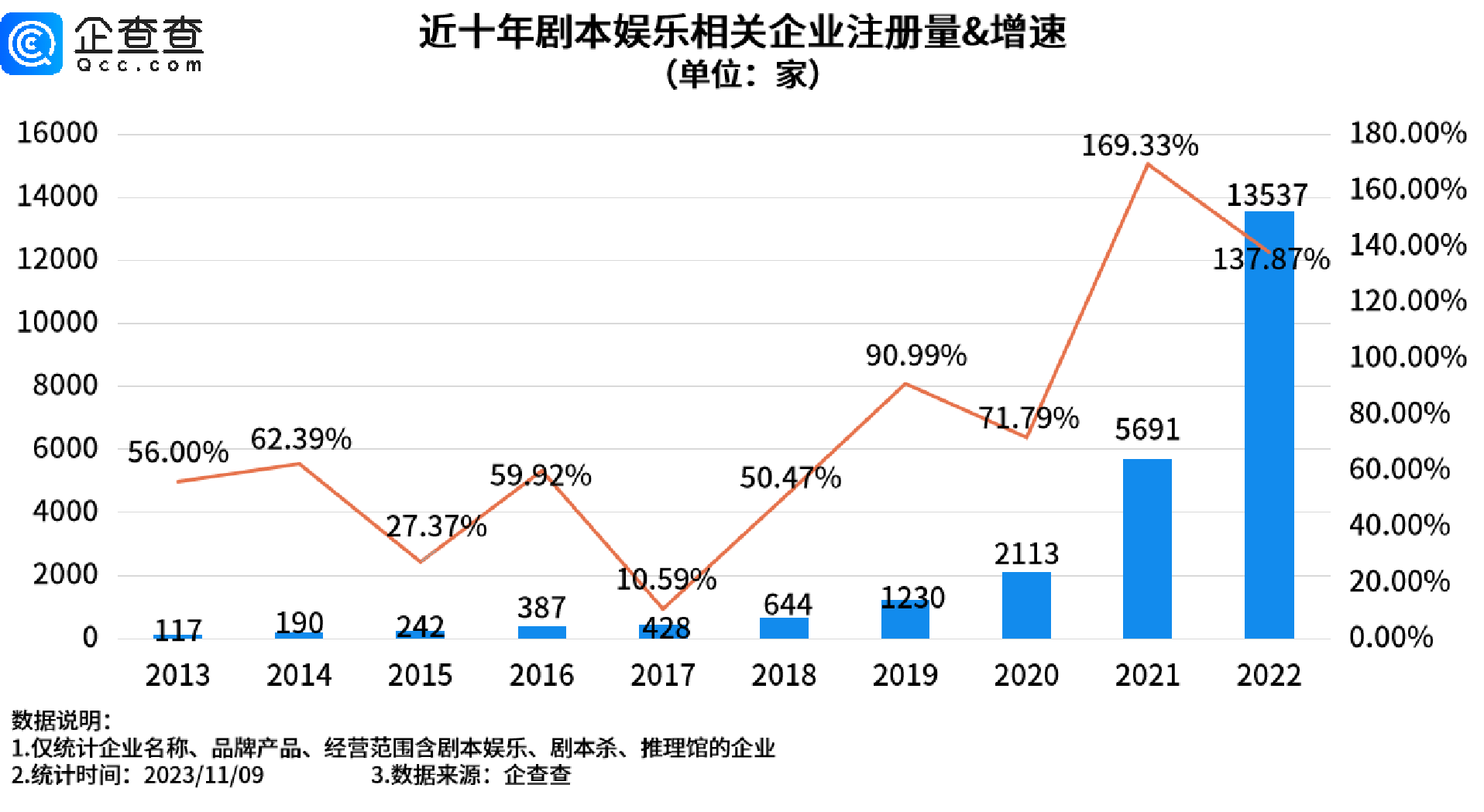 2022年,剧本娱乐相关企业注册量再创新高,达1.35万家,同比增长137.87%。
