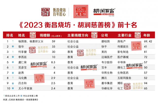 2023胡润慈善榜正式发布。碧桂园的杨国强、杨惠妍父女以59亿元捐赠额首次位列胡润慈善榜第一;快手宿华以33亿元捐赠额位列第二;美的何享健以30亿元捐赠额排名第三。胡润慈善榜上榜门槛为1亿元人民币,今年有34人上榜,共计捐赠191亿元,比去年减少74%,主要因为去年有四位百亿级捐赠,而今年一个都没有。前十位上榜慈善家均位列今年胡润百富榜,捐赠额占他们总财富的2%。