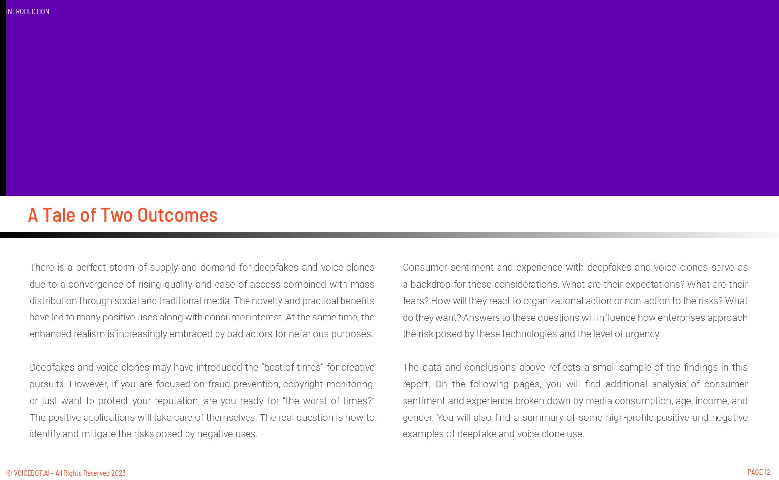 Voicebot.ai发布了“深度伪造技术和语音克隆之消费者情绪报告”。每项新技术的出现都会带来有利有弊的应用。尽管许多《星球大战》、《美国达人秀》、网络游戏和无数幽默 YouTube 视频的粉丝都喜欢克隆声音和深度伪造的出现,但这些技术在欺诈、造谣和损害个人声誉方面的应用也在不断增加。这些技术如此之好,而我们又充斥着如此之多的数字媒体,以至于人们现在很难分辨真假。Pindrop 的一项研究表明,人们识别深度假新闻的准确率仅为 57%。