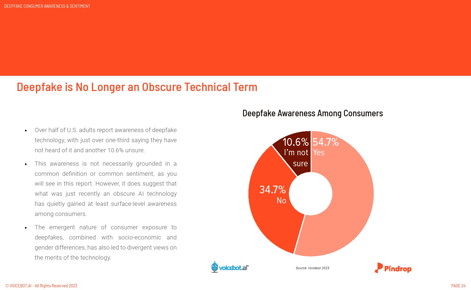 Pindrop与 Voicebot.ai 合作,围绕深度伪造和语音克隆技术揭示消费者的体验和感知。超过半数的美国成年人对深度伪造的认知度高于预期。语音克隆的认知度更高,达到 64%。这种技术的扩散速度很快,消费者的担忧也是理所当然的。值得庆幸的是,对于希望主动保护客户的公司来说,已经有了解决方案。