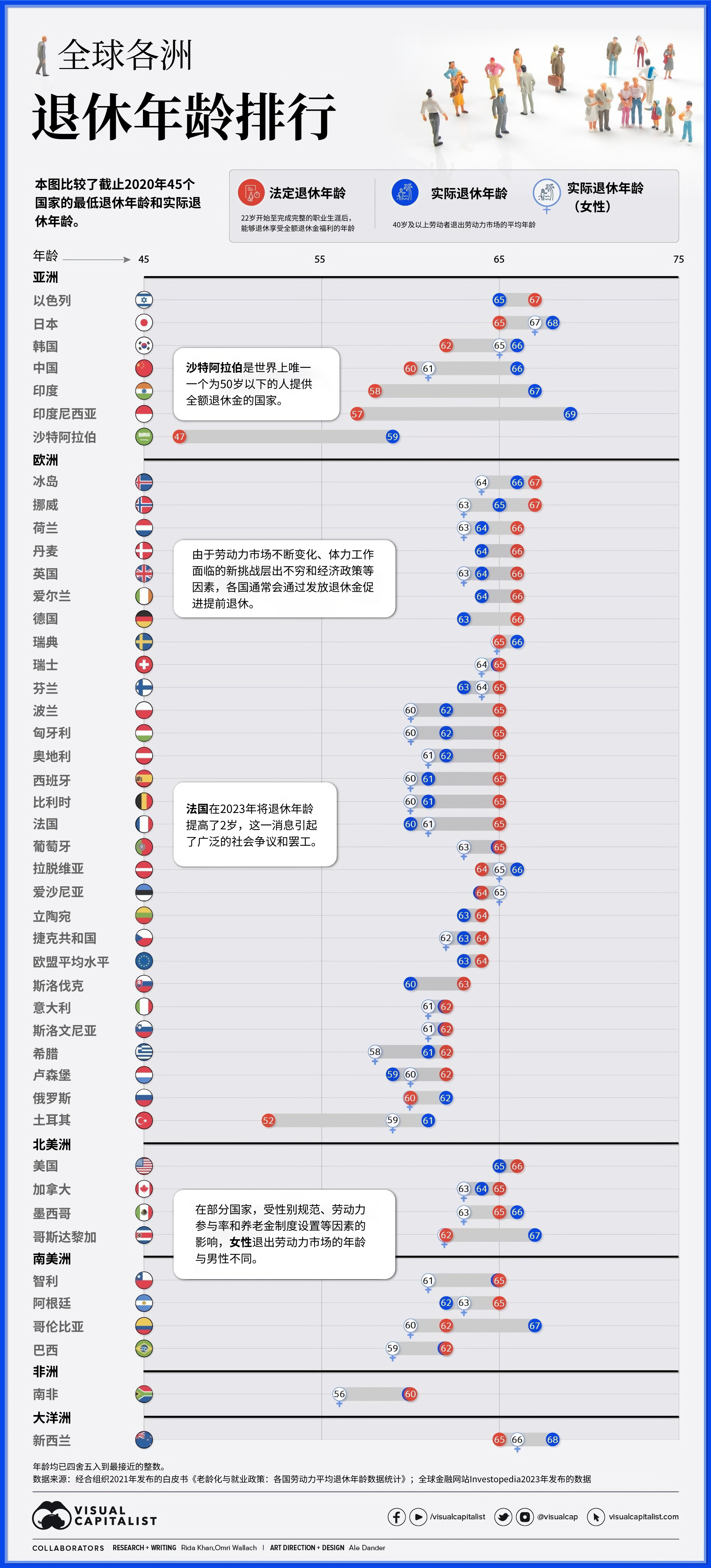 该图汇编了经合组织在2021年发布的白皮书《老龄化与就业政策:各国劳动力平均退休年龄数据统计》中的数据,深入研究了45个国家2020年的法定和实际退休年龄。